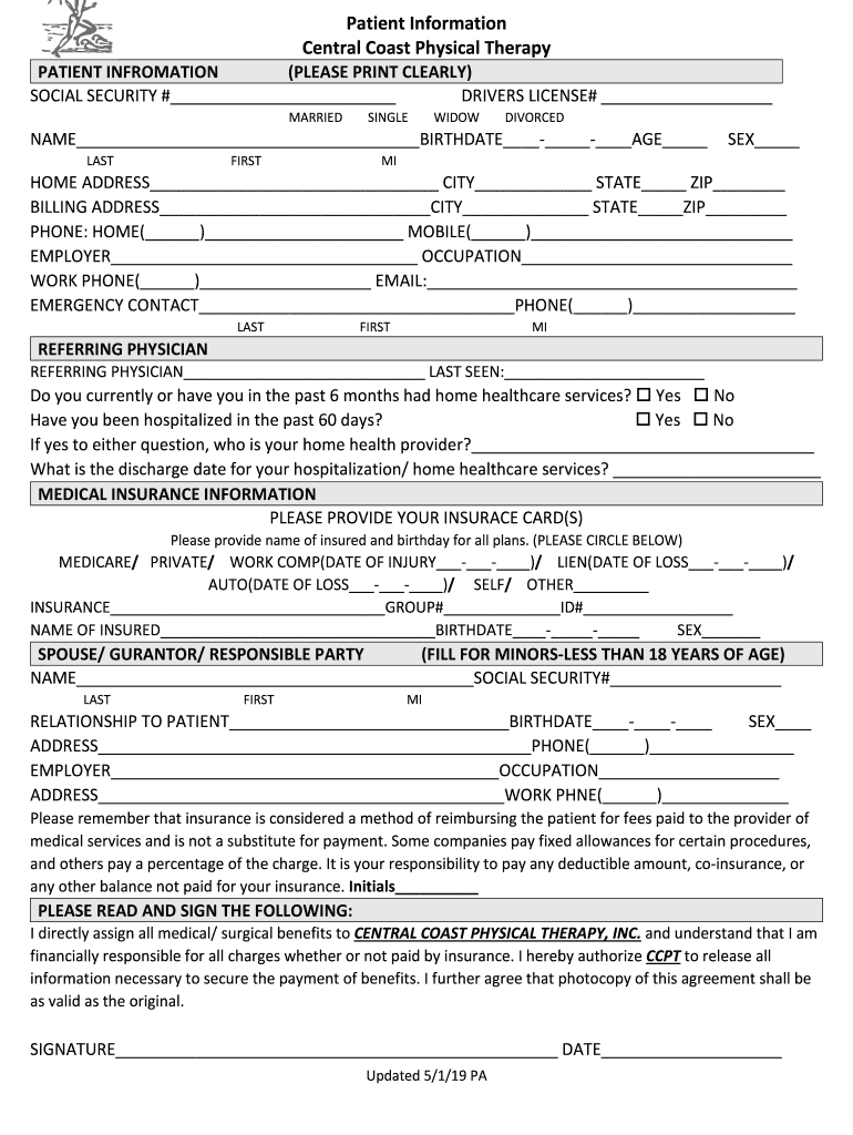 Patient Information Central Coast Physical TherapyPATIENT INFORMATION (PLEASE PRINT CLEARLY) SOCIAL SECURITY # Driver's LICENSE# MARRIEDSINGLEWIDOWDIVORCEDNAME BIRTHDATE AGE LASTFIRSTSEX HOME ADDRESS