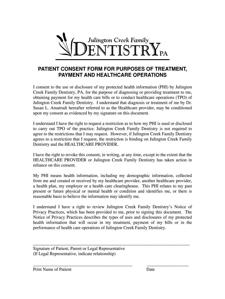 PATIENT CONSENT FORM FOR PURPOSES OF TREATMENT,