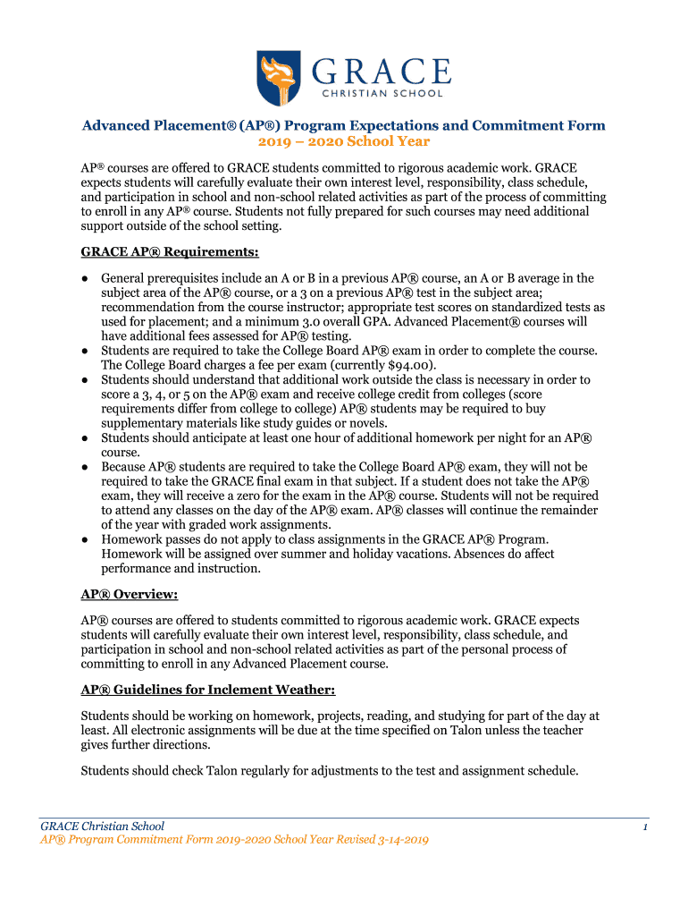Advanced Placement (AP) Program Expectations and Commitment Form 2019 2020 School Year AP courses are offered to GRACE students committed to rigorous academic work. GRACE expects students will carefully