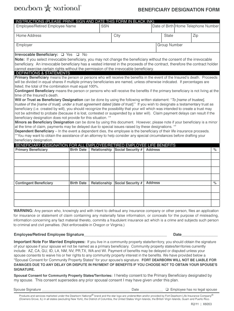 The Beneficiary Designation Form is meant for current employees and retired employees of companies that offer life insurance benefits. Spouses also play a crucial role if spousal consent is necessary.