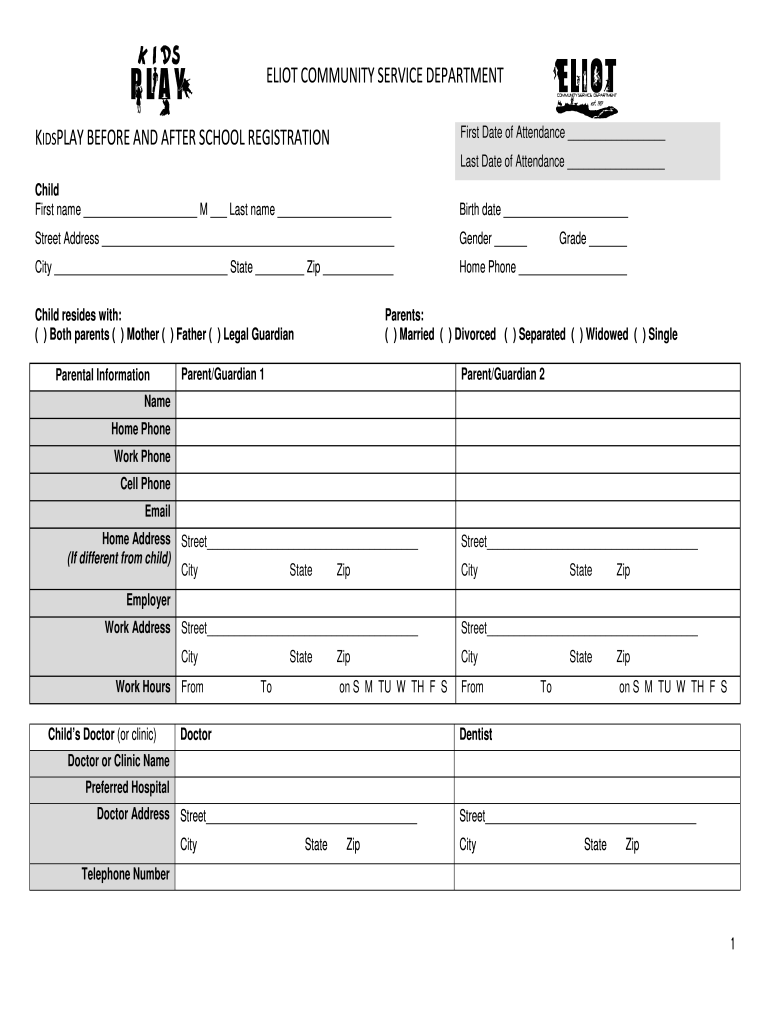 ELIOT COMMUNITY SERVICE DEPARTMENT First Date of Attendance DISPLAY BEFORE AND AFTER SCHOOL Registrations Date of Attendance Child First name M Last name Birth date Street Address Gender City State
