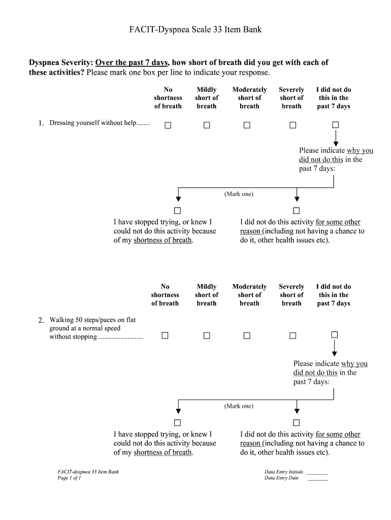 FACITDyspnea Scale 33 Item BankDyspnea Severity: Over the past 7 days, how short of breath did you get with each of