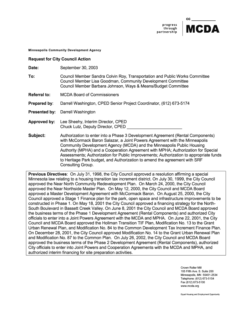 Cc MCDAprogress through partnership Minneapolis Community Development AgencyRequest for City Council Action Date:September 30, 2003To:Council Member Sandra Colvin Roy, Transportation and Public Works