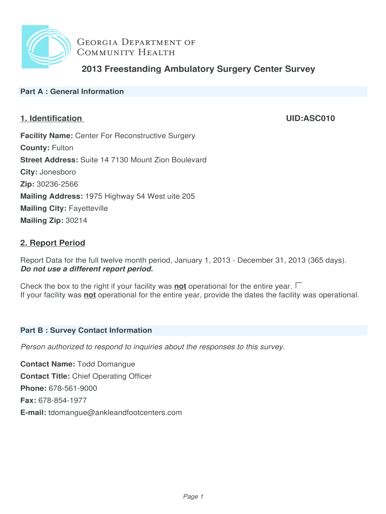 2013 Freestanding Ambulatory Surgery Center Survey Part A : General Information1. Identification:ASC010Facility Name: Center For Reconstructive Surgery County: Fulton Street Address: Suite 14 7130