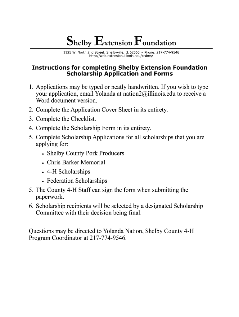 Shelby Extension Foundation 1125 W. North 2nd Street, Shelbyville, IL 62565 Phone: 2177749546 http://web.extension.illinois.edu/ccdms/Instructions for completing Shelby Extension Foundation Scholarship