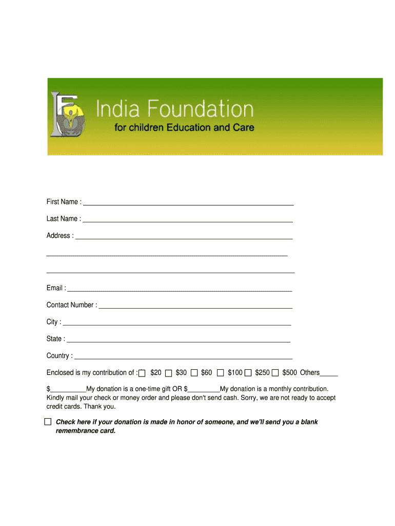 First Name : Last Name : Address : Email : Contact Number : City : State : Country : Enclosed is my contribution of : $$$$$$$203060100250500 Others $ My donation is a onetime gift OR $ My donation