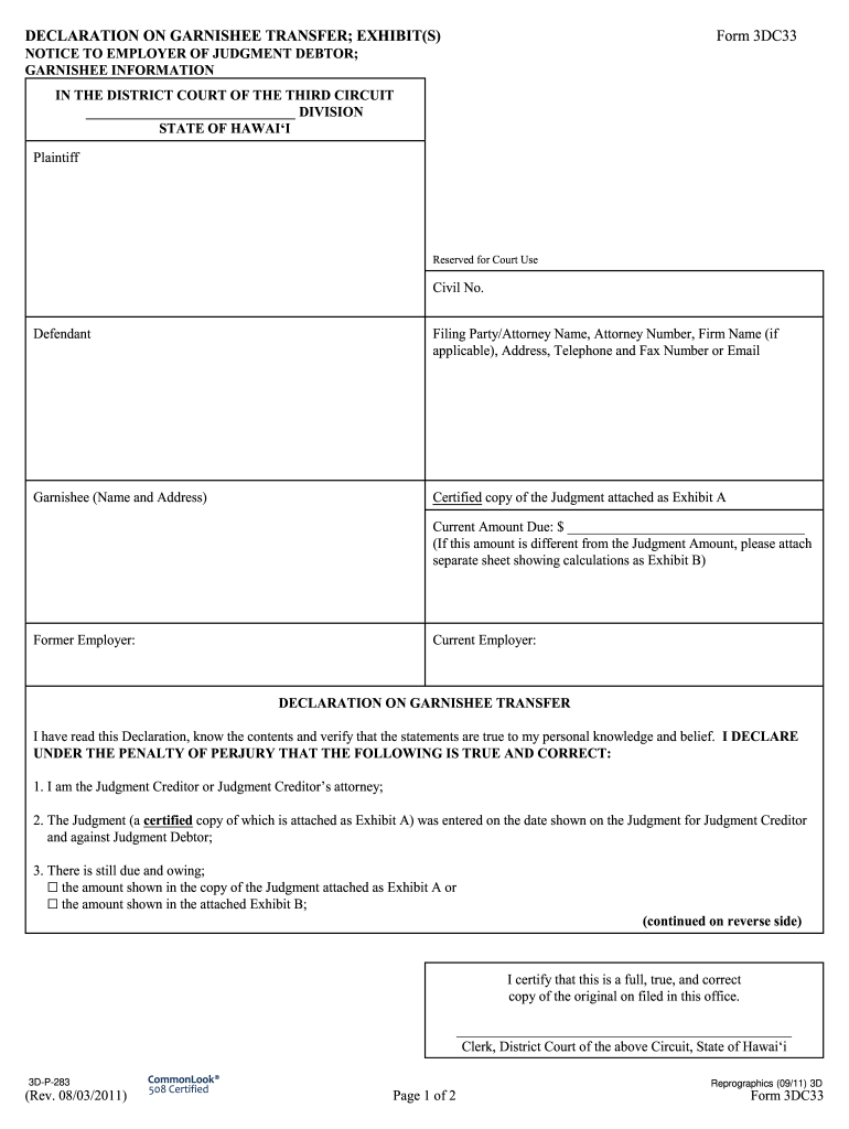 Form 3DC33DECLARATION ON GARNISHEE TRANSFER; EXHIBIT(S) NOTICE TO EMPLOYER OF JUDGMENT DEBTOR; GARNISHEE INFORMATION IN THE DISTRICT COURT OF THE THIRD CIRCUIT DIVISION STATE OF HAWAII PlaintiffReserved