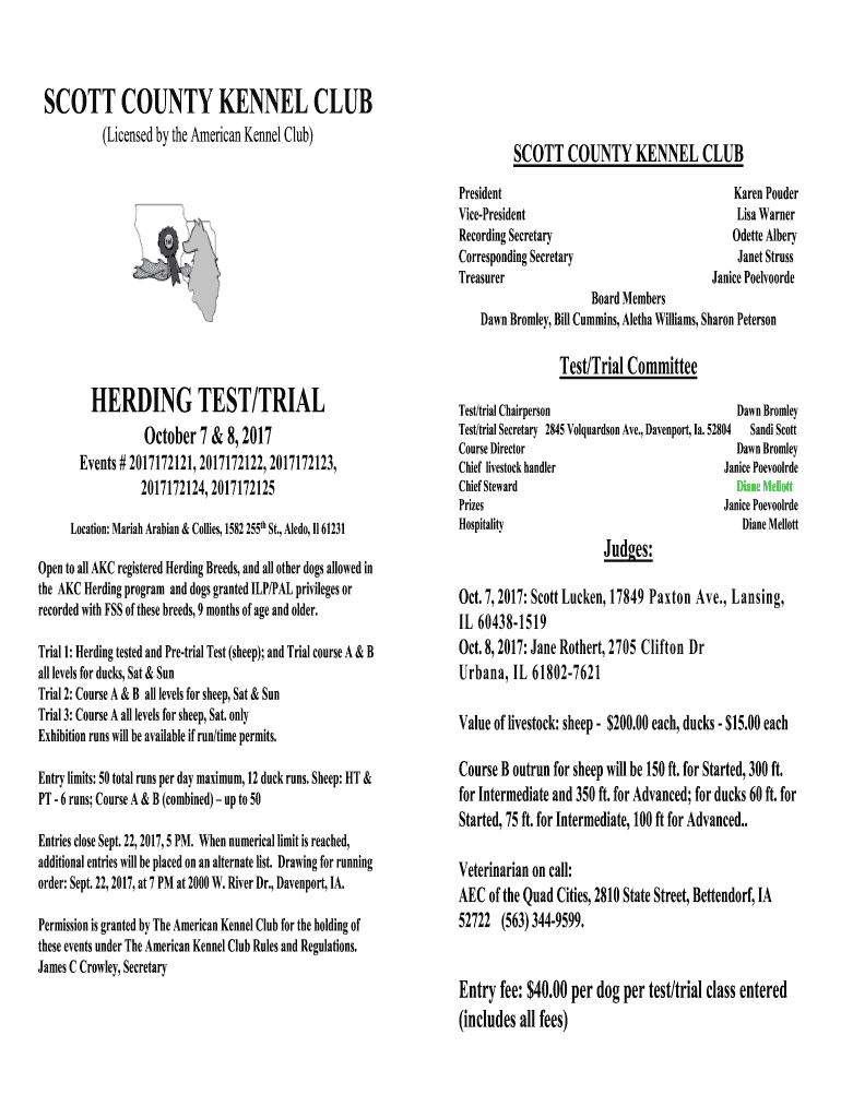 SCOTT COUNTY KENNEL CLUB (Licensed by the American Kennel Club)SCOTT COUNTY KENNEL CLUB President VicePresident Recording Secretary Corresponding Secretary Treasurer Karen Powder Lisa Warner Odette