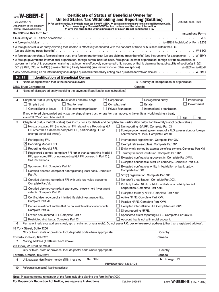 United States Tax Withholding and Reporting (Entities)(Rev. July 2017)a Department of the Treasury