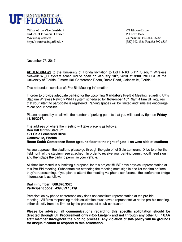 Get the free ADDENDUM #1 to the University of Florida Invitation to Bid ITN18RL-111 Stadium Wireless