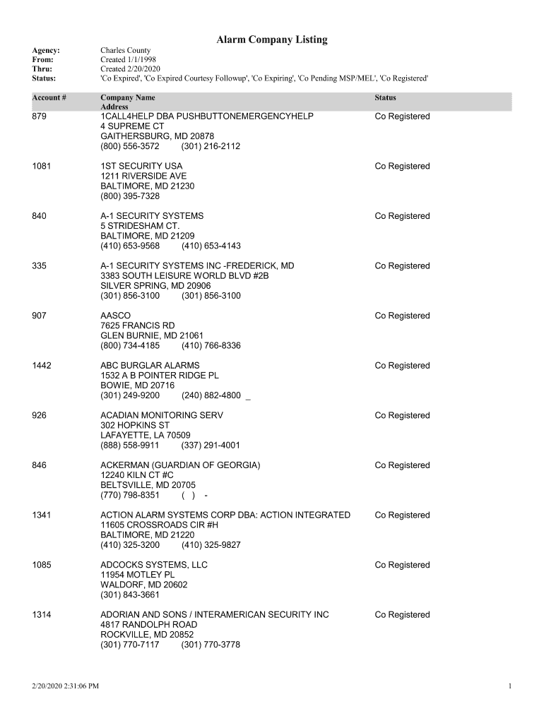 Alarm Company Listing Agency: From: Through: Status:Charles County Created 1/1/1998 Created 2/20/2020 'Co Expired ', 'Co Expired Courtesy Followup ', 'Co Expiring ', 'Co Pending MAP/MEL ', 'Co Registered