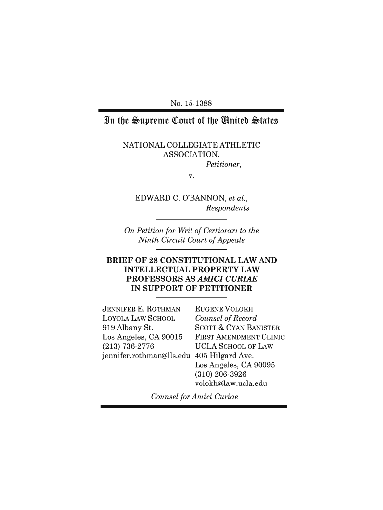 No. 151388In the Supreme Court of the United States NATIONAL COLLEGIATE ATHLETIC ASSOCIATION, Petitioner, v. EDWARD C. BANNON, et al., Respondents On Petition for Writ of Certiorari to the Ninth Circuit