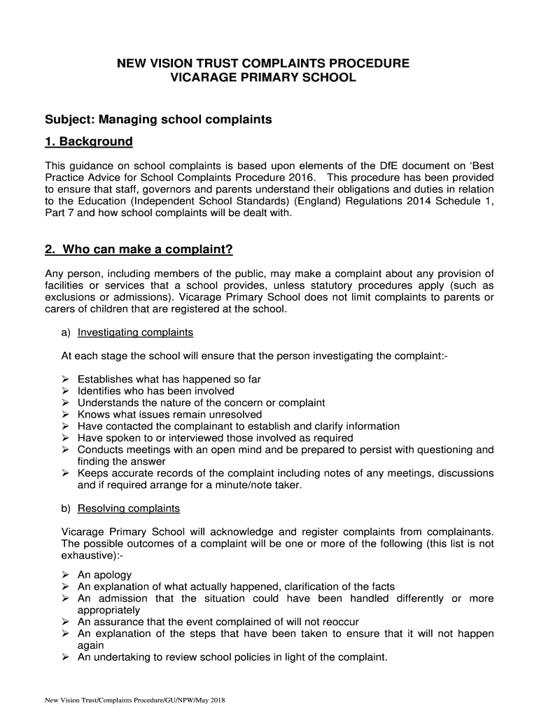 Get the free NEW VISION TRUST COMPLAINTS PROCEDURE VICARAGE PRIMARY SCHOOL ...