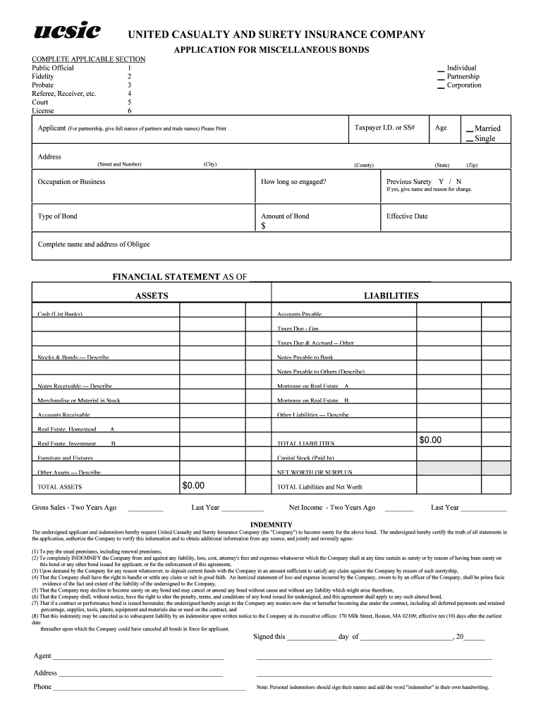 USIC UNITED CASUALTY AND SURETY INSURANCE COMPANY APPLICATION FOR MISCELLANEOUS BONDS COMPLETE APPLICABLE SECTION Public Official 1 Fidelity 2 Probate 3 Referee, Receiver, etc. 4 Court 5 License 6