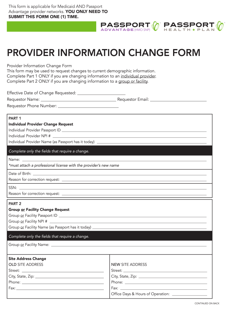This form is applicable for Medicaid AND Passport Advantage provider networks. YOU ONLY NEED TO SUBMIT THIS FORM ONE (1) TIME. ADVANTAGE (HMO SNP)PROVIDER INFORMATION CHANGE FORM Provider Information