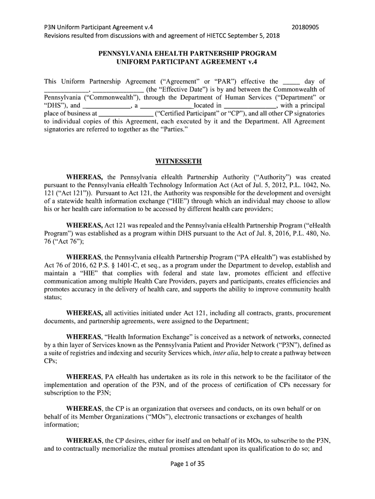 P3N Uniform Participant Agreement v.4 Revisions resulted from discussions with and agreement of HIE TCC September 5, 201820180905PENNSYLVANIA HEALTH PARTNERSHIP PROGRAM UNIFORM PARTICIPANT AGREEMENT