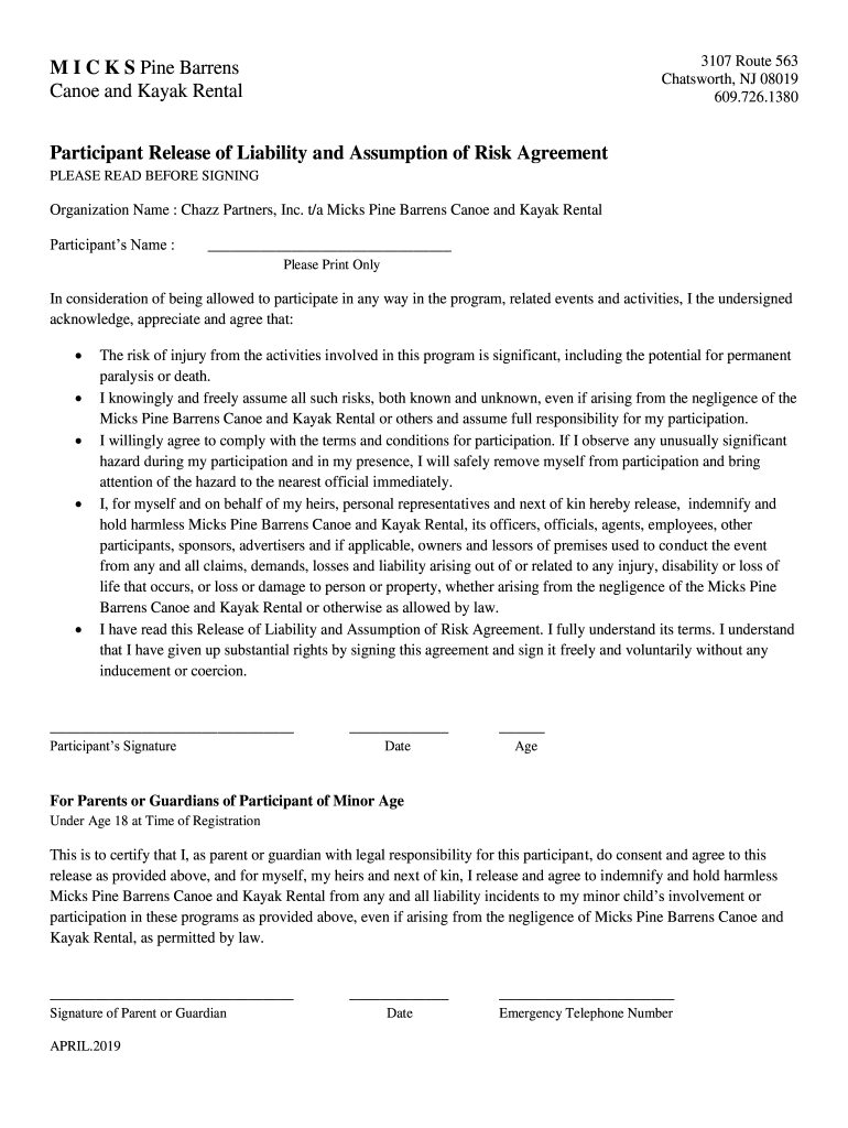 3107 Route 563 Chats worth, NJ 08019 609.726.1380M I C K S Pine Barrens Canoe and Kayak Rental Participant Release of Liability and Assumption of Risk Agreement PLEASE READ BEFORE SIGNINGOrganization