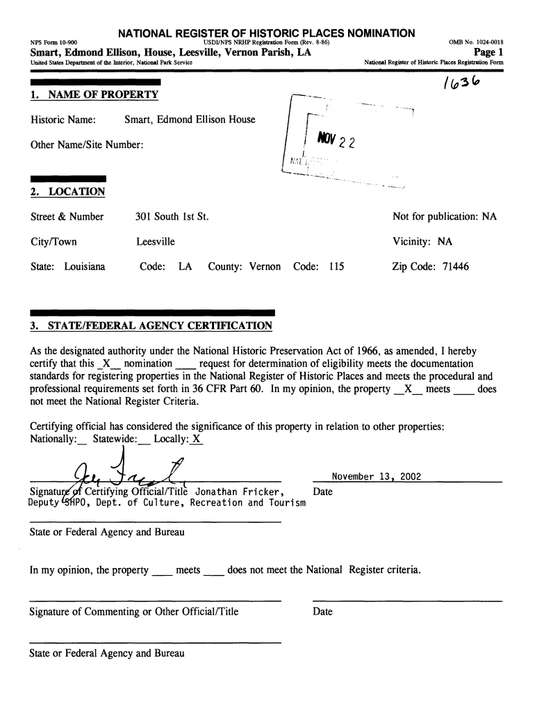 NATIONAL REGISTER OF HISTORIC PLACES NOMINATION NFS Fond 10900USDI/NPS CNRHP Registration Form (Rev. 886)OMB No. 10240018Smart, Edmond Ellison, House, Lewisville, Vernon Parish, Lavage 1United States