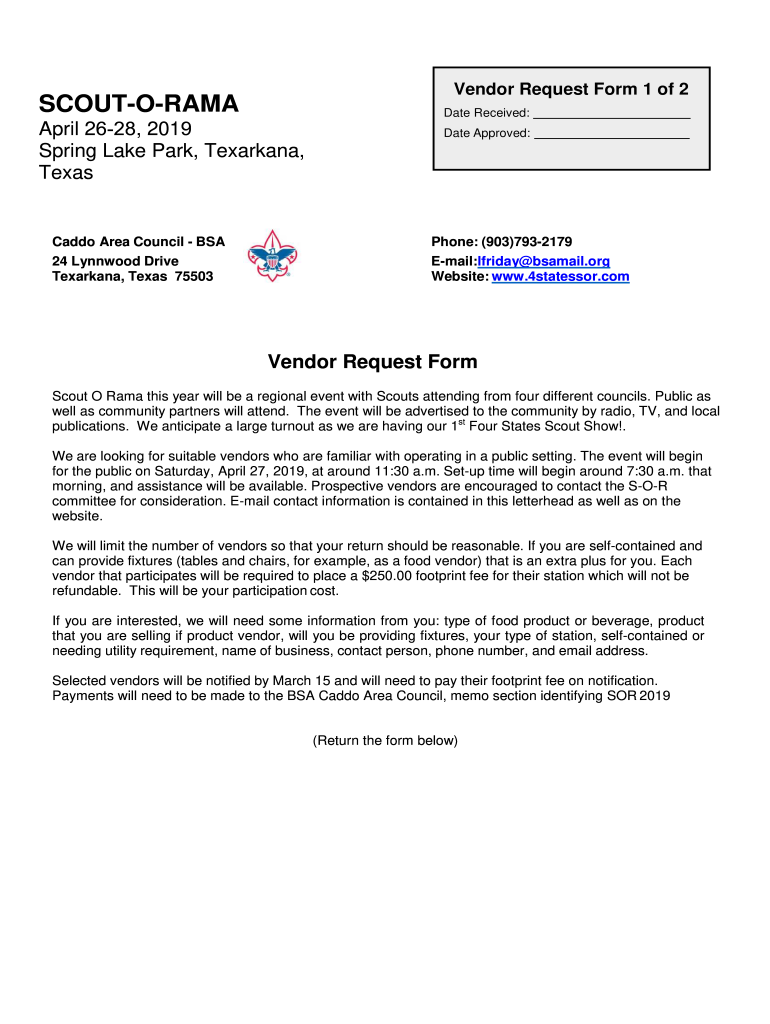 Vendor Request Form 1 of 2SCOUTORAMADate Received:April 2628, 2019 Spring Lake Park, Texarkana, TexasCaddo Area Council BSA 24 Lynnwood Drive Texarkana, Texas 75503Date Approved:Phone: (903)7932179