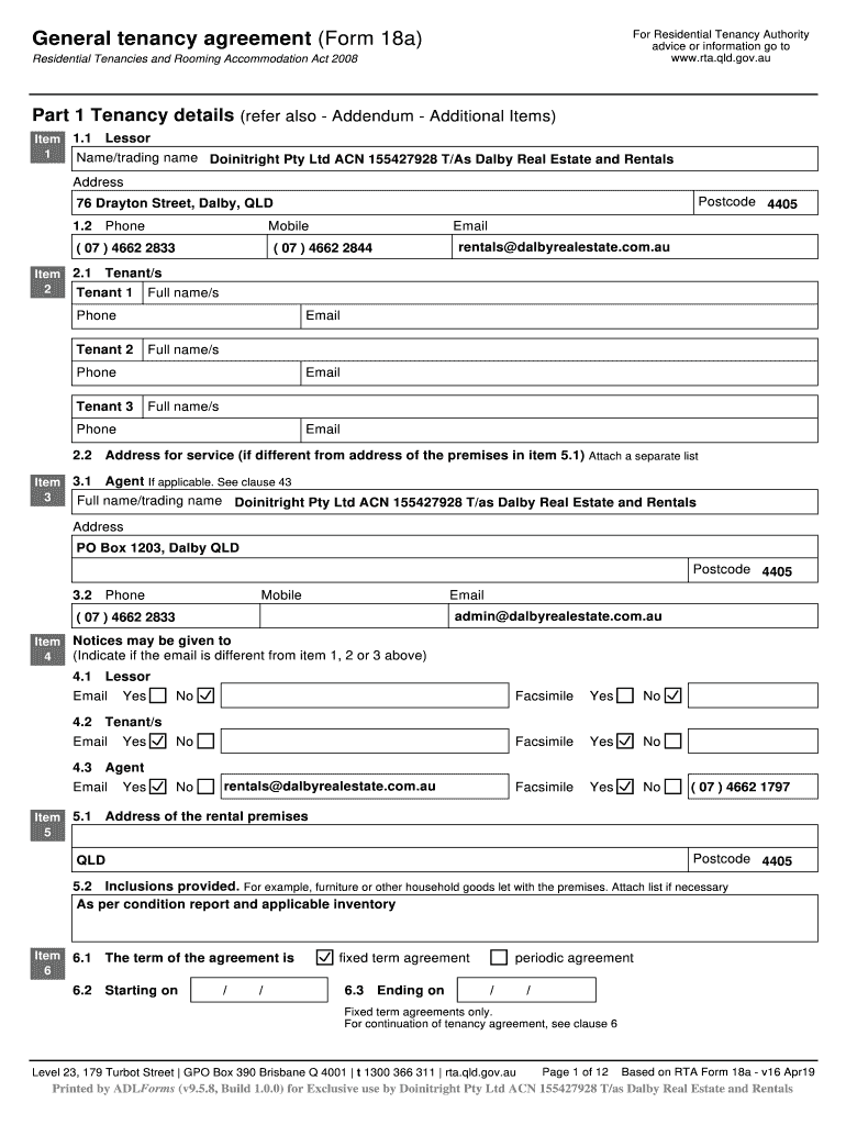 For Residential Tenancy Authority advice or information go to www.rta.qld.gov.auGeneral tenancy agreement (Form 18a) Residential Tenancies and Rooming Accommodation Act 2008Part 1 Tenancy details