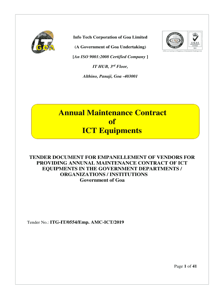 Info Tech Corporation of Goa Limited (A Government of Goa Undertaking) An ISO 9001:2008 Certified Company IT HUB, 3rd Floor, Albino, Panama, Goa 403001Annual Maintenance Contract of ICT EquipmentsTENDER