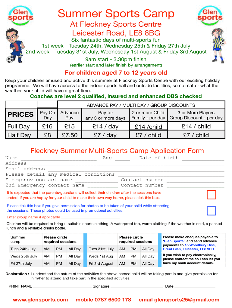 Summer Sports Camp At Flecked Sports CentreLeicester Road, LE8 8BGSix fantastic days of multi sports fun1st week Tuesday 24th, Wednesday 25th & Friday 27th July2nd week Tuesday 31st July, Wednesday