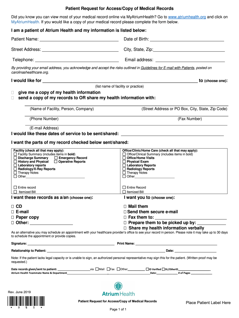Patient Request for Access/Copy of Medical Records Did you know you can view most of your medical record online via MyAtriumHealth? Go to www.atriumhealth.org and click on MyAtriumHealth. If you would