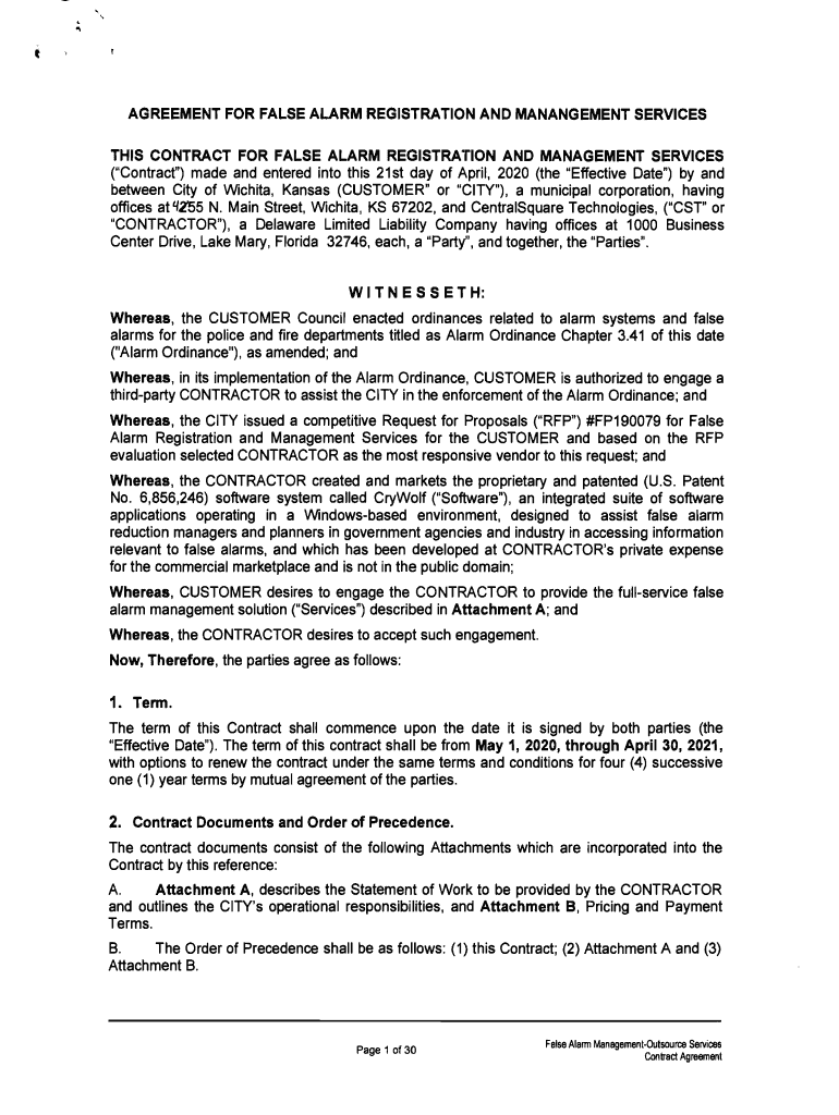 ., 'AGREEMENT FOR FALSE ALARM REGISTRATION AND MANAGEMENT SERVICES THIS CONTRACT FOR FALSE ALARM REGISTRATION AND MANAGEMENT SERVICES (“Contract “) made and entered into this 21st day of April
