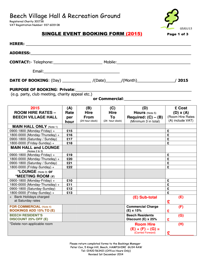 Beech Village Hall & Recreation Ground Registered Charity 301738 VAT Registration Number: 937 6019 0805/01/15SINGLE EVENT BOOKING FORM (2015)Page 1 of 3HIRER: ADDRESS: CONTACT: Telephone: Mobile: