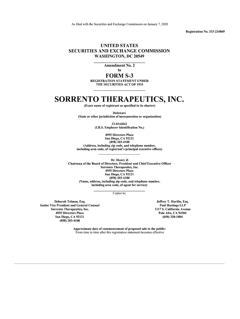 As filed with the Securities and Exchange Commission on January 7, 2020, Registration No. 333234869UNITED STATES SECURITIES AND EXCHANGE COMMISSION WASHINGTON, DC 20549 Amendment No. 2 form S3 REGISTRATION