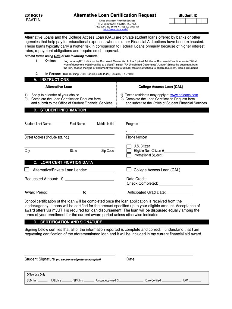 Alternative Loan Certification Request20182019 FAATLNStudent Office of Student Financial Services P. O. Box 20036 Houston, TX 77225 (713) 5003860 phone (713) 5003863 fax https://www.uth.edu/sfs/Alternative