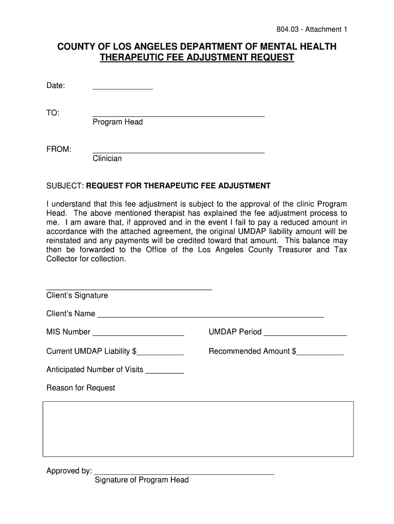 804.03 Attachment 1COUNTY OF LOS ANGELES DEPARTMENT OF MENTAL HEALTH THERAPEUTIC FEE ADJUSTMENT REQUEST Date: TO: Program Headroom: ClinicianSUBJECT: REQUEST FOR THERAPEUTIC FEE ADJUSTMENT I understand