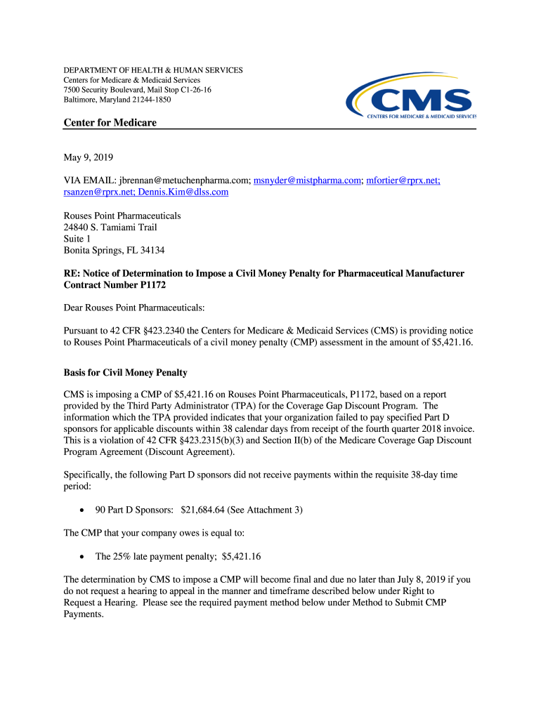 DEPARTMENT OF HEALTH & HUMAN SERVICES Centers for Medicare & Medicaid Services 7500 Security Boulevard, Mail Stop C12616 Baltimore, Maryland 212441850Center for Medicare May 9, 2019, VIA EMAIL: Brennan