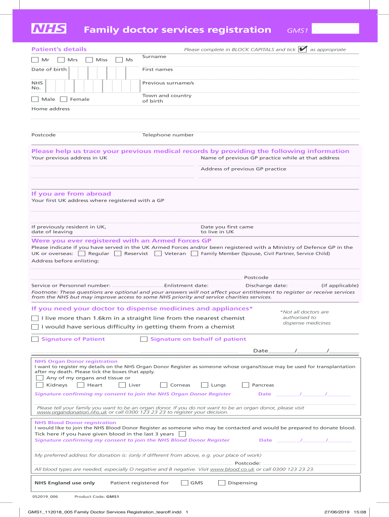 Patients detailsGMS1Please complete in BLOCK CAPITALS and ticks appropriateSurname