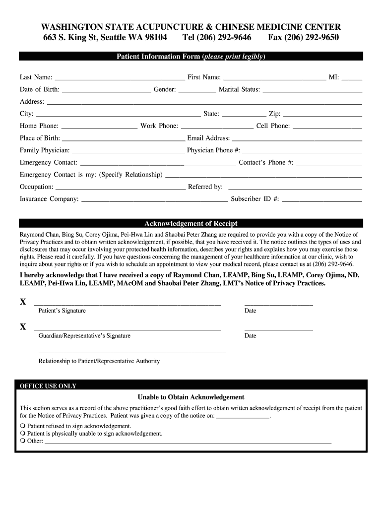 WASHINGTON STATE ACUPUNCTURE & CHINESE MEDICINE CENTER 663 S. King St, Seattle WA 98104 Tel (206) 2929646 Fax (206) 2929650 Patient Information Form (please print legibly) Last Name: First Name: MI: