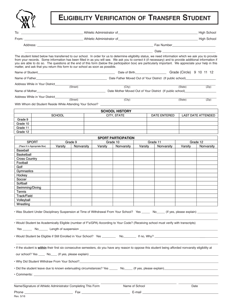 To:From:ELIGIBILITY VERIFICATIONOFAthletic Administrator transfer Studentship SchoolAthletic Administrator address:High Schoolbag Number
