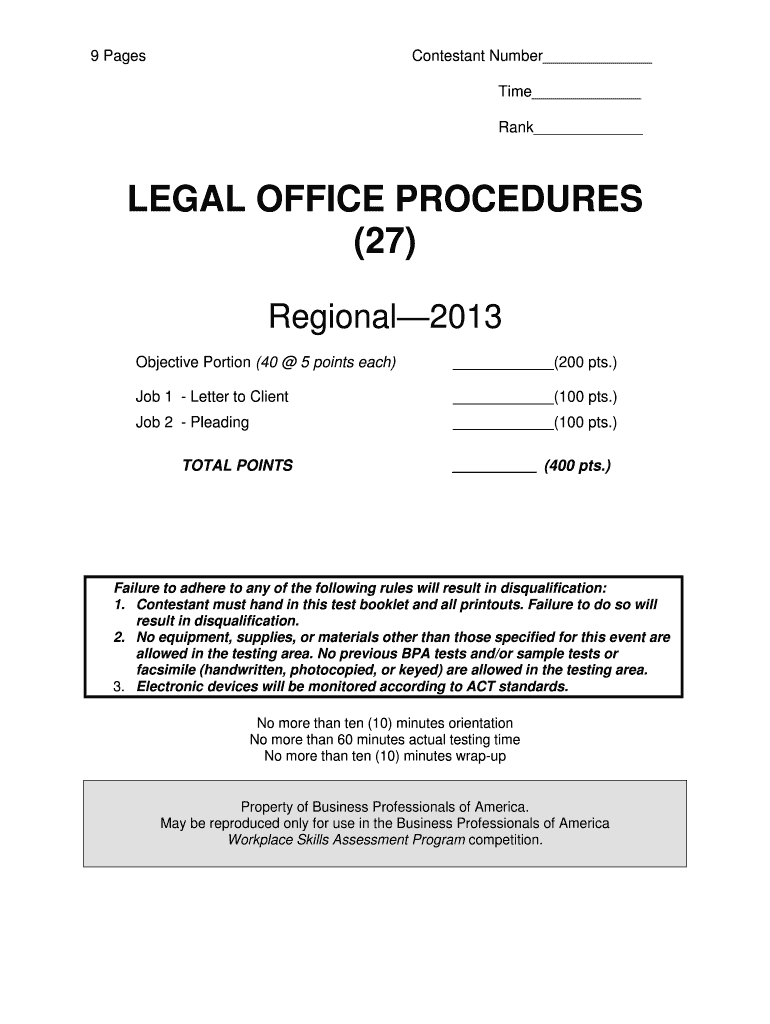 9 Pages Contestant Number Time Rank LEGAL OFFICE PROCEDURES (27) Regional2013 Objective Portion (40 5 points each) (200 pts.) Job 1 Letter to Client (100 pts.) Job 2 Pleading (100 pts.) TOTAL POINTS