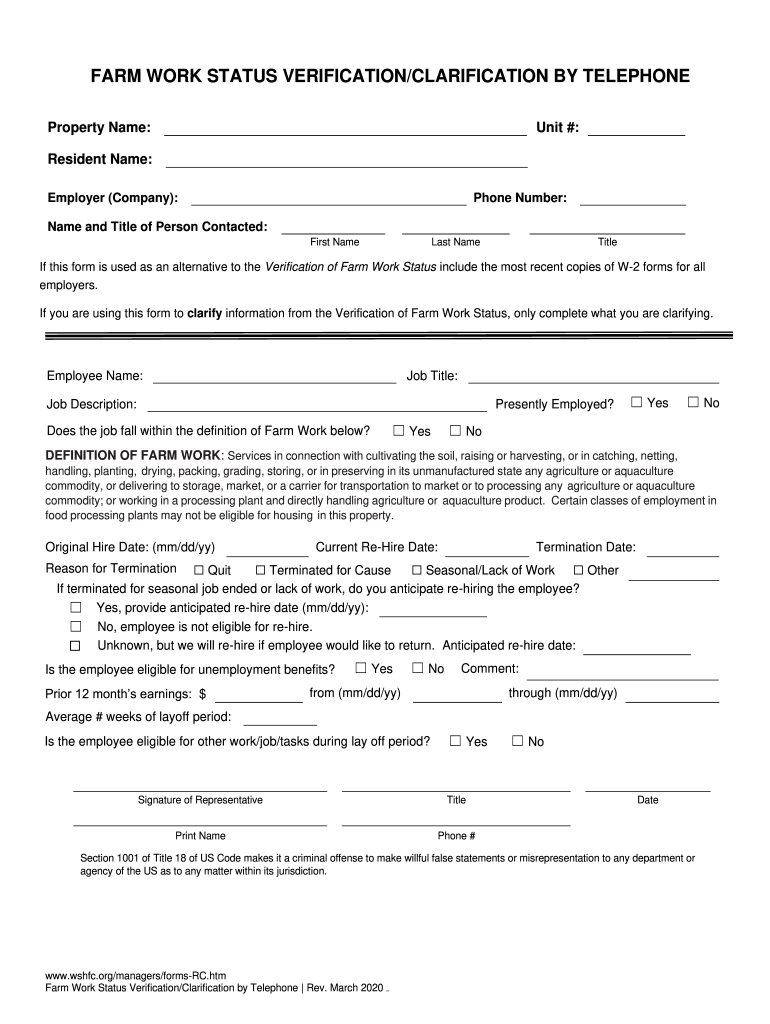 Get the free WSHFCAMCForms-RCFormsFarm Work Status Verification/Clarification by Telephone