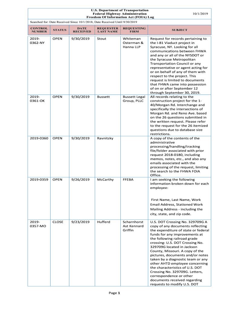 U.S. Department of Transportation Federal Highway Administration Freedom Of Information Act (FOIA) Log10/1/2019Searched for: Date Received Since 10/1/2018, Date Received Until 9/30/2019 CONTROL NUMBERSTATUSDATE