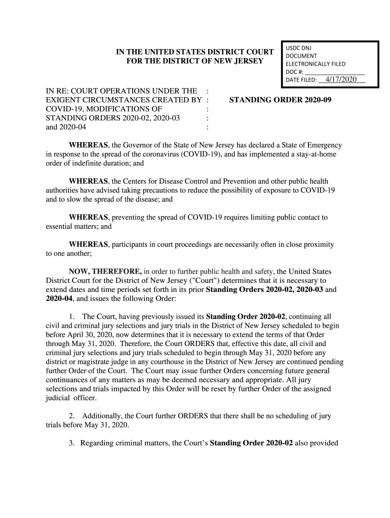 IN THE UNITED STATES DISTRICT COURT FOR THE DISTRICT OF NEW JERSEY IN RE: COURT OPERATIONS UNDER THE EXIGENT CIRCUMSTANCES CREATED BY COVID-19, MODIFICATIONS OF STANDING ORDERS 202002, 202003 and