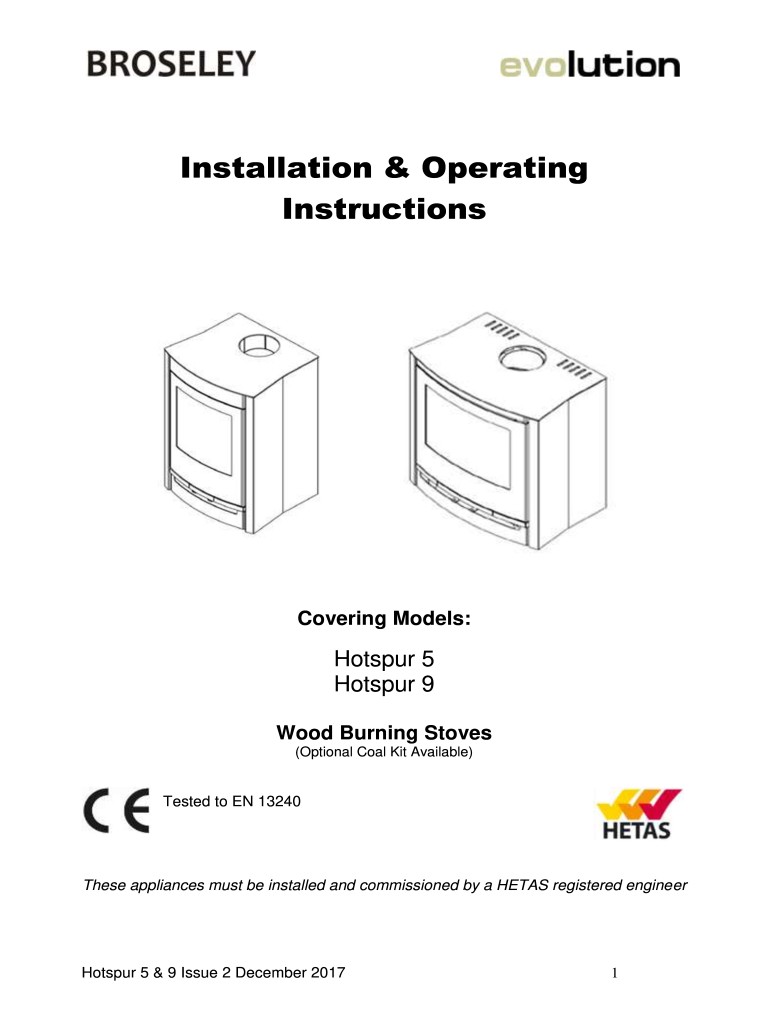 Installation & Operating InstructionsCovering Models:Hot spur 5 Hot spur 9 Wood Burning Stoves (Optional Coal Kit Available)Tested to EN 13240These appliances must be installed and commissioned by