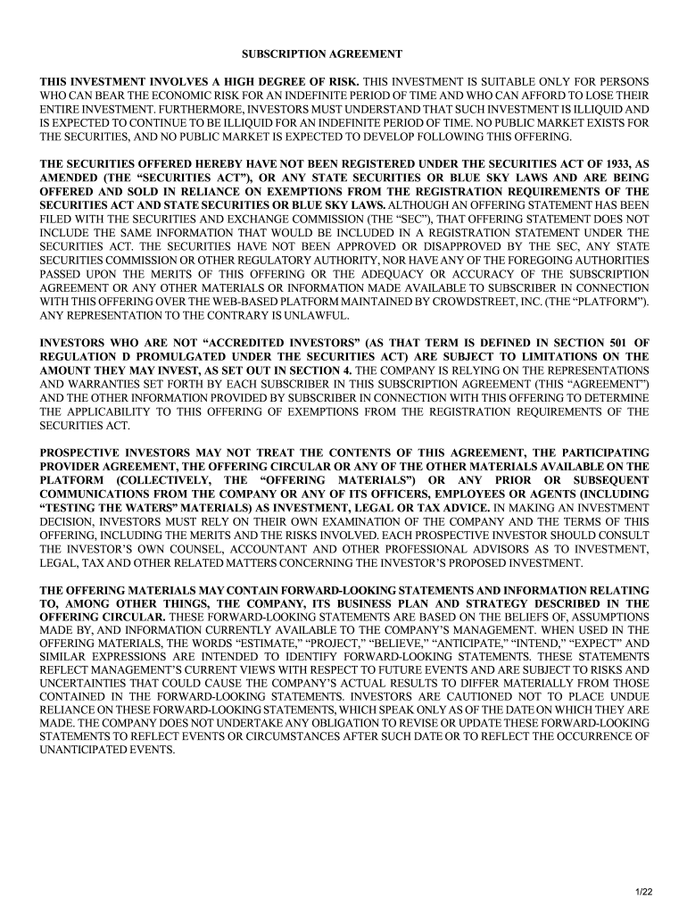 Get the free Form of Subscription Agreement for the Regulation A+ Offering.