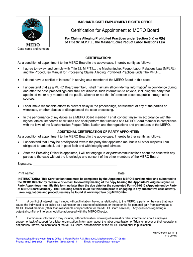 MASHANTUCKET EMPLOYMENT RIGHTS OFFICE Certification for Appointment to HERO Board For Claims Alleging Prohibited Practices under Section 6(a) or 6(b) of Title 32, M.P.T.L., the Mashantucket Pequot