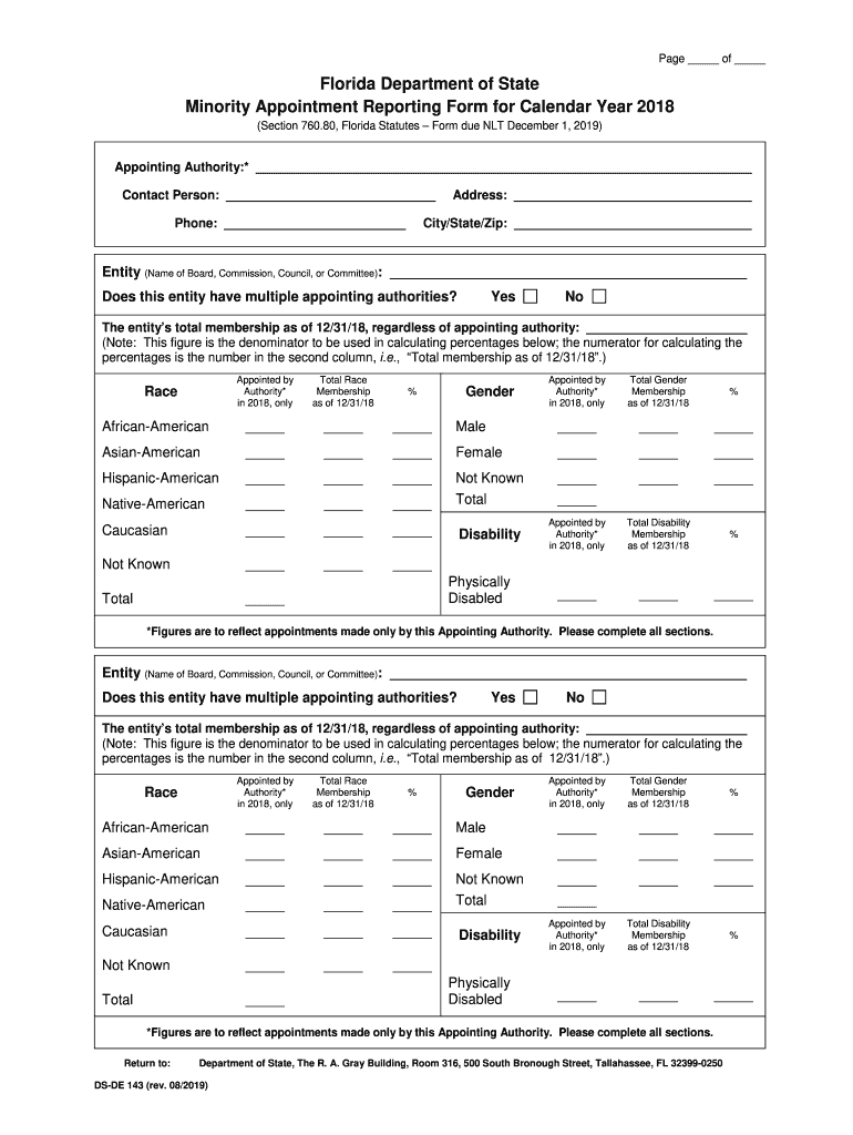 Page of Florida Department of State Minority Appointment Reporting Form for Calendar Year 2018 (Section 760.80, Florida Statutes Form due NLT December 1, 2019)Appointing Authority:* Contact Person: