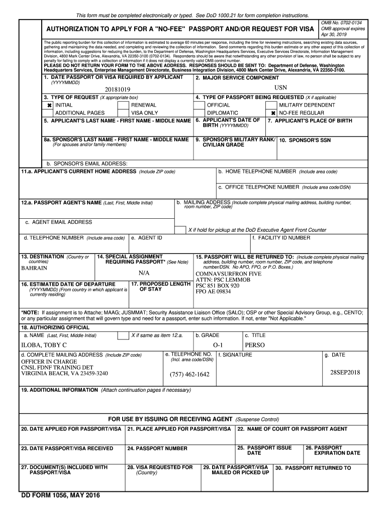 This form must be completed electronically or typed. See DoD 1000.21 for form completion instructions. AUTHORIZATION TO APPLY FOR A “NOTED PASSPORT AND/OR REQUEST FOR VISA PRIVACY ACT STATEMENT