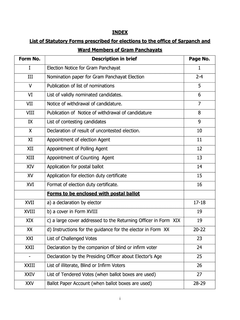 Form No. Description in brief Page No. Election Notice for Gram Panchayat1IIINomination