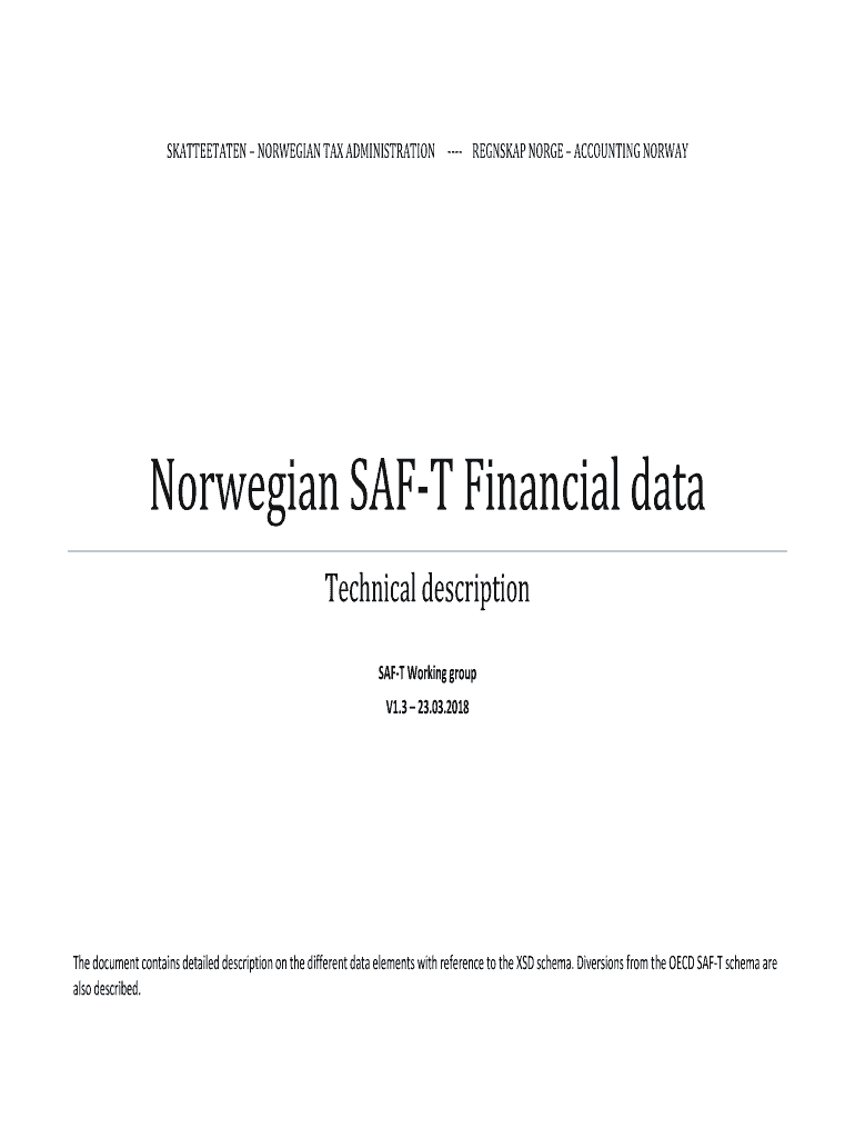 SKATTEETATEN NORWEGIAN TAX ADMINISTRATION REGNAL NORSE ACCOUNTING NORWAYNorwegian SAFE Financial data Technical description SAFE Working group V1.3 23.03.2018The document contains detailed description