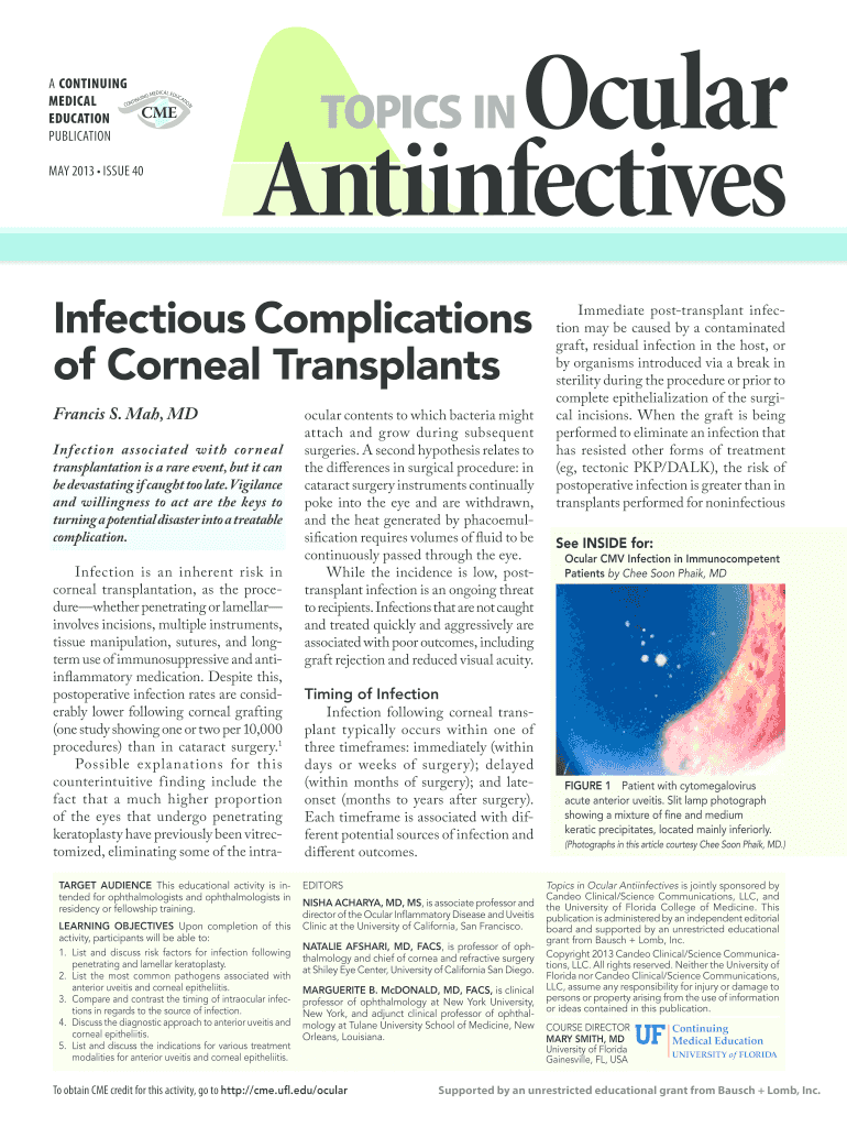 A CONTINUING MEDICAL CME EDUCATION PUBLICATION N DIAL EDU G ME CA IN TO TIN CON MAY 2013 ISSUE 40 Ocular Anti-infectives TOPICS IN Infectious Complications of Corneal transplants Francis S. My, MD