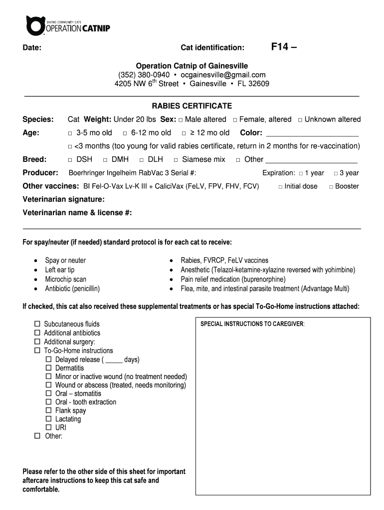 The Rabies Certificate should be submitted as soon as the cat is vaccinated to ensure compliance with local regulations. Check with your local animal control for any specific timelines.