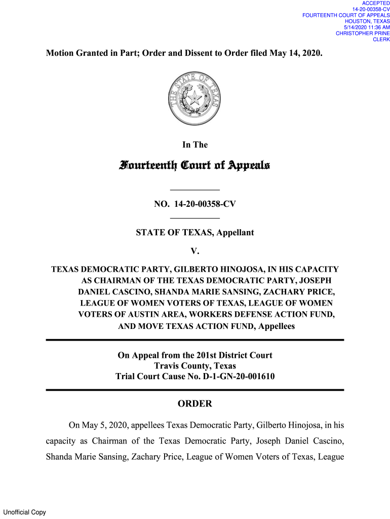 ACCEPTED 142000358CV FOURTEENTH COURT OF APPEALS HOUSTON, TEXAS 5/14/2020 11:36 AM CHRISTOPHER PRINCE CLERKMotion Granted in Part; Order and Dissent to Order filed May 14, 2020. In Fourteenth Court